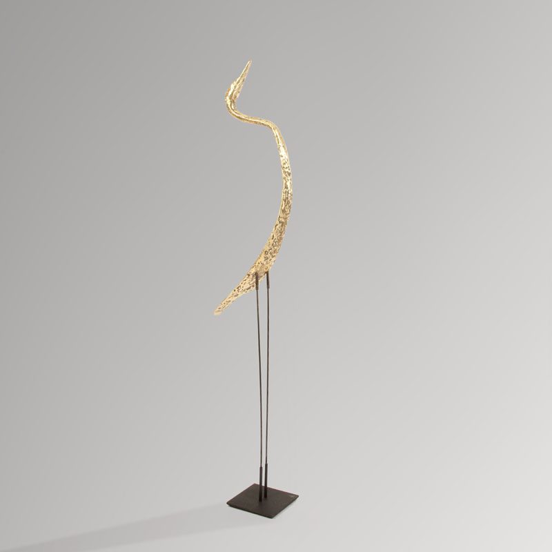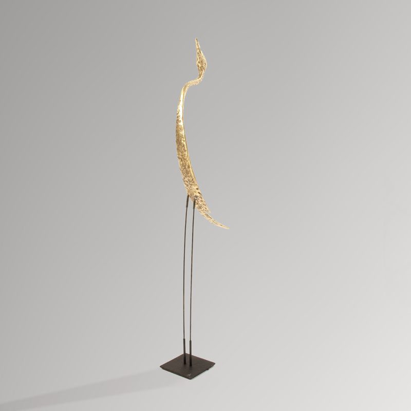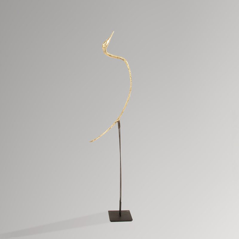 Les tiges en métal se glissent dans les tubes soudés au socle d’une part et à l’oiseau d’autre part. Celui-ci peut donc être retiré du socle pour planter les tiges dans la terre si la sculpture est destinée à vivre dans un jardin.